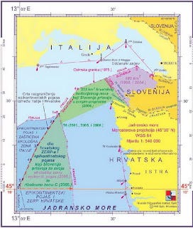Slika 3: Strah Hrvaške: epikontinentalni pas in ekonomska cona Slovenije pred hrvaškimi obalami.