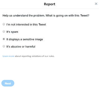 Pa jo je še Tviter utišal! Zakaj, tega ne moremo natančno vedeti. Komu jo je utišal, tudi tega ne vemo. Postopek ni transparenten, nanj ni pritožbe. Dvomim, da je kak algoritem v grafih našel kar spotakljivega. Bolj verjetno je, da je najeta vojska človeških ali strojnih (ro)botov na tviterju naredila dovolj prijav, da je tvit problematičen in Tviter ga skriva. Za vsak tvit je namreč v meniju na desni (izbira Report tweet) mogoče odpreti takle obrazec: