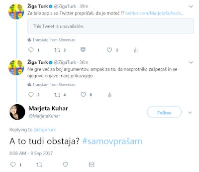 Citirani tvit (quoted Tweet) je bil nedostopen. To bi se lahko zgodilo, če bi avtorico imel blokirano, utišano (mute) ali pa, če bi tviter "ugotovil", da je objava nedostojna, žaljiva, vsebuje elemente sovražnega govora ipd. Prvo in drugo ne drži, torej gre za obliko cenzure, na kar sem občutljiv: