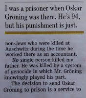 Tako piše sin ubitega v Auschwitzu, ko komentira proces proti 94-letnemu računovodji tistega taborišča, ki se je te dni končal v Nemčiji z obsodbo uradnika. "Ubil ga je genocidni sistem, v katerem je Groening zavestno sodeloval. Da so ga poslali v zapor, je usluga človeštvu, da se take stvari ne bi ponavljale".