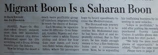 V tujem tisku jim večinoma pravijo migranti. Kar tudi so. Tuj časopis analizira, kako so migranti dober posel za podjetnike, ki jih vozijo preko Sahare. Analiza transportnih poti, zaslužkov ... Junak zgodbe ni "begunec" ampak trafikant z ljudmi. V petih letih da je zaslužil dovolj za hišo s petimi spalnicami, je lastnik trgovine, kupuje nove Toyote, da bo razširil posel, po katerem je vedno več povpraševanja. "Revnim pomagamo v kraje, kjer je več priložnosti", pravi.