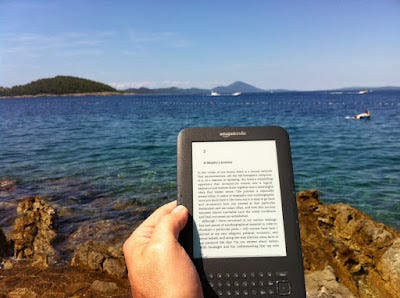 Za preživetje v taki divjini potrebujemo tri stvari. Ležanik, sončnik in dobro knjigo. Prvo dvoje, skupaj z brisačo, nudi vsak na pol spodoben hotel kjerkoli, razen na Hrvaškem in v Sloveniji. Tu sta to stebra izvenpenzionske ponudbe. Sem stvar vzamemo seboj. Namesto knjig sem letos vzel seboj Kindle. Po štirih letih sem ga le kupil. iPad-a se mi zdi (1.) škoda za na plažo, (2.) razen v debeli senci se ne da brati, (3.) prsti zapacani s kremo za sonce in iPad ne gredo najbolj skupaj.