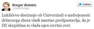 Prvič, vlada ni odpovedala Univerzijade, ampak je samo ugotovila, da sredstev za Univerzijado v proračunu ni. Morda bi morala bolj jasno zapisati, da jih ni zagotovil minister Lukšič. In povedala je, da organizator ne more računati na drugačno rešitev v rebalansu: da vlada nima tistih 30 milijonov, ki jih je Organizacijski odbor (vključno z, pozor, še ministrom Lukšičem) 31.1.2012 zahteval od prihajajoče vlade. Slednje zaradi slabih dosedanjih priprav in kritičnega stanja v proračunu. Mimogrede, luknja, ki sta mi jo pustila ministra Lukšič in Žekš je težka 185.000.000 evrov. Povedano drugače, ob sedanji dinamiki porabe imam denarja v proračunu za učitelje, umetnike, kulturnike, znanstvenike do sredine novembra.