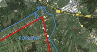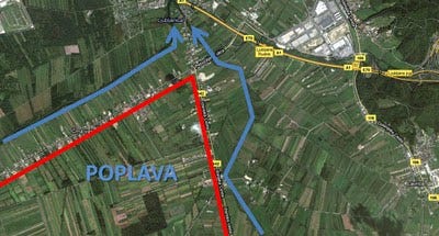 Stroka torej predlaga, da bi se cesto prebilo proti Ljubljanici (dodatna modra puščica spodaj). Strah tistih na severni strani Črnovaške ceste je razumljiv. Vode bo tekla na njihovo stran. Ampak Ljubljanica je blizu in mogoče je izračunati, kakšen mora biti ta preboj, da gre voda samo do Ljubljanice in da se ne razliva. To bi morali ljudem razložiti. Ljubljanica je bila včeraj vsaj en meter nižja kot dan prej.