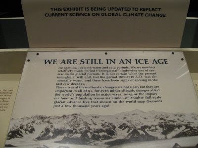 Na vrhu slike je pripis, da ta del razstave prenavljajo, da bo vključevala zadnja spoznanja o klimatskih spremembah. Ki bodo diametralno nasprotna od tega, kar piše. Namreč, da je bilo na začetku stoletja hladno, v zadnjih desetletjih je pa vedno topleje.