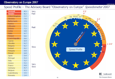 Think-tank Ambrosetti je naredil razmeroma podrobno analizo o konkurenčnosti Evrope oz. članic EU. Eden od kazalcev, ki so ga računali je, kako hitro se države EU bližajo ciljem, ki si jih je EU zastavila do leta 2010 na področju zaposlovanja, R&D, izobraževanja, notranjega trga in okolja oz. energije - skupaj 10 parametrov. In po tej študiji smo na četrtem mestu: